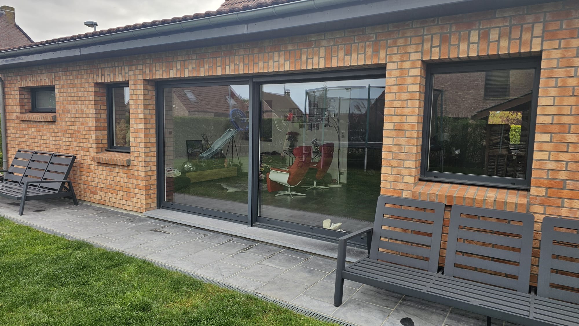 L'aluminium se prête parfaitement aux grandes dimensions : il ne se déforme pas, ne gonfle pas avec l'humidité et permet des profilés fins pour maximiser la surface vitrée. Ce chantier à Comines en est une belle illustration : la vue sur le jardin est dégagée, le vitrage traité anti-reflets limite les éblouissements, et la couleur anthracite s'harmonise naturellement avec la brique rouge de la façade.